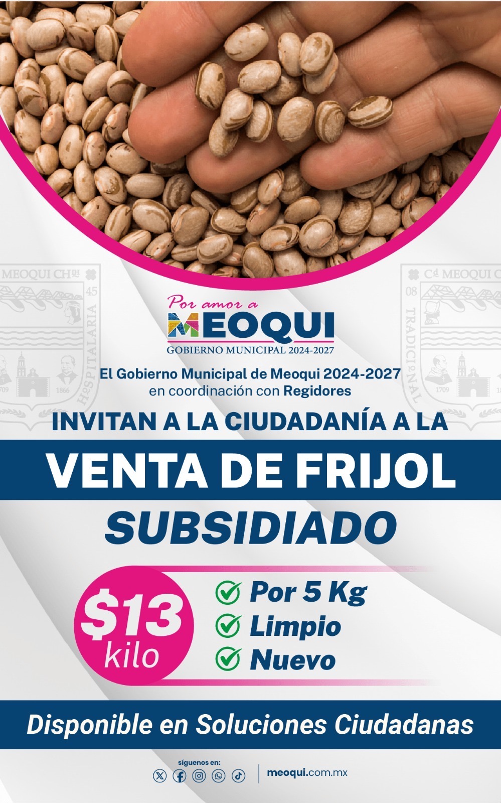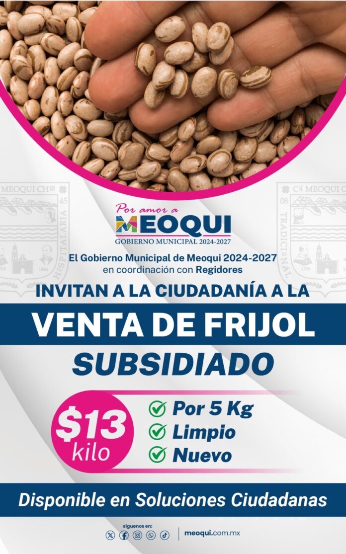 Meoqui.- El Gobierno Municipal de Meoqui continúa con el programa de frijol subsidiado, ofreciendo este producto de la canasta básica a un precio accesible, ahora por la cantidad de 13 pesos por kilo, con un límite de hasta cinco kilos por familia. Así lo informó Miguel Gómez Hermosillo, director de Soluciones Ciudadanas, quien destacó que este programa atiende la encomienda de la alcaldesa Miriam Soto de apoyar la economía de las familias meoquenses, contribuyendo a la reducción de gastos en el hogar.