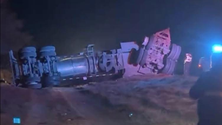 Un aparatoso accidente se registró en las primeras horas de este jueves en la carretera Saucillo-Delicias, a la altura del kilómetro 121, cuando una pipa cargada con leche sufrió un desperfecto en uno de sus tanques, el cual se desprendió y volcó fuera de la cinta asfáltica.