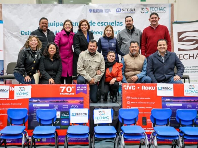 El presidente municipal de Delicias, Jesús Valenciano García, agradeció y reconoció el respaldo de la Fundación del Empresariado Chihuahuense, A.C. (FECHAC) y de la Secretaría de Educación y Deporte, a través de Servicios Educativos del Estado de Chihuahua (SEECH), por su compromiso permanente con la educación, durante la entrega de equipamiento a escuelas federales de Delicias y de la región centro-sur del estado, evento en el que fungió como anfitrión.