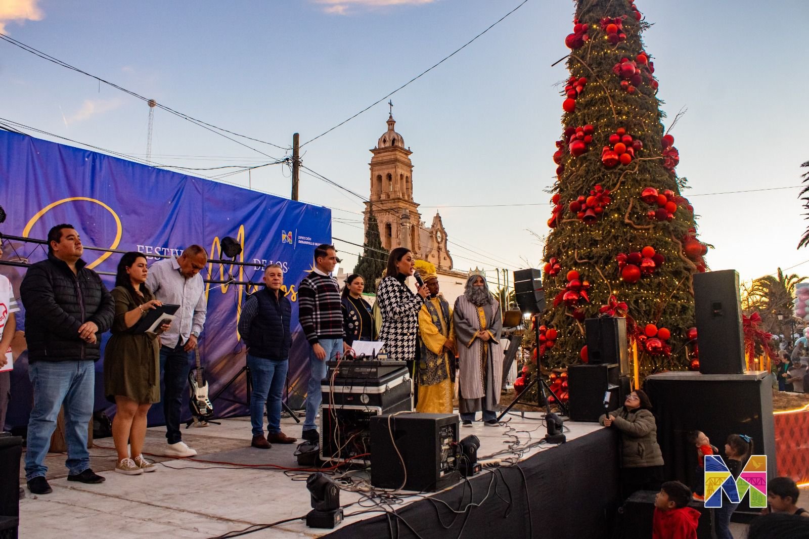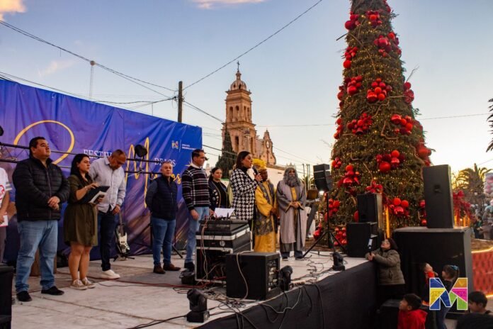 MEOQUI.- En un ambiente de alegría, tradición y unión familiar, la alcaldesa de Meoqui, Miriam Soto, encabezó la celebración del Día de Reyes Magos en la Plaza Principal, donde cientos de familias se dieron cita para disfrutar de una tarde llena de sorpresas y convivencia con el show del payaso Bombín, la mega rosca de 50 metros, además de dulces, regalos y la presencia de los Reyes Magos, así como también el tradicional Domingo de Serenata.