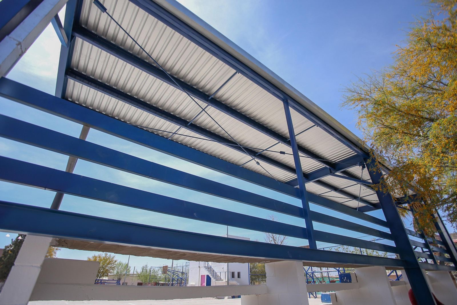 Delicias.- La Dirección de Obras Públicas de Delicias avanza en la fase final de la construcción de una techumbre sobre gradas en la cancha de la plaza principal de la colonia Campesina, informó su titular, Alfonso Rodríguez Porras. El proyecto forma parte de las obras ejecutadas a través del esquema de presupuesto participativo.