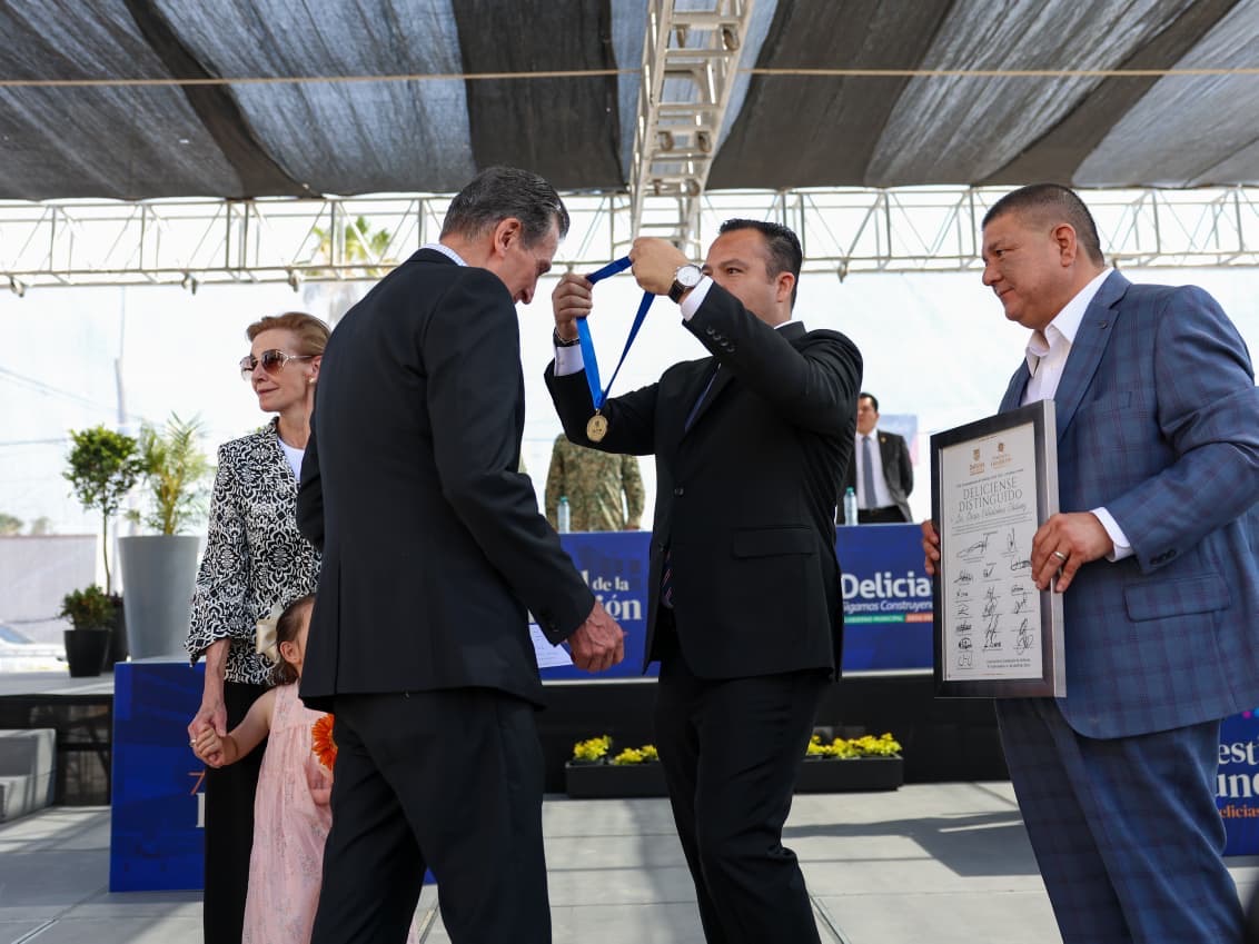 Delicias.- En el punto donde inició el trazo original de la ciudad se llevó a cabo el evento cívico con motivo del 93 aniversario de Delicias, ceremonia encabezada por el presidente municipal Jesús Valenciano García y el fiscal general del estado César Jáuregui Moreno, quienes entregaron la Medalla al Mérito Ciudadano Fundadores 2026 al Óscar Villalobos Chávez por su trayectoria y aportaciones a la comunidad.