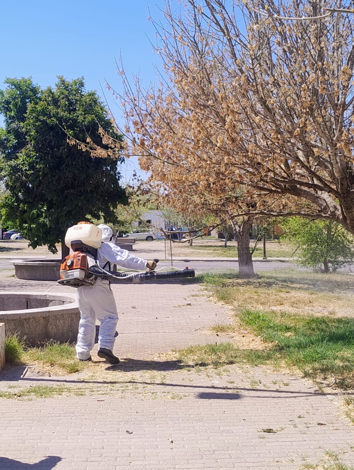 Delicias.- Gracias a un trabajo coordinado entre la dirección de Servicios Públicos y la jefatura de Medioambiente, se intervino de manera inmediata tras la detección de una plaga en árboles de la Plaza El Pedregal, situación que fue reportada por ciudadanos y atendida desde la tarde del pasado martes.