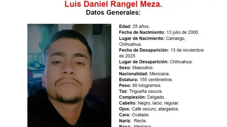 Camargo.- Este jueves se confirmó la localización sin vida de Luis Daniel Rangel Meza, joven de 25 años de edad que había sido reportado como desaparecido desde el pasado 13 de noviembre de 2025 tras salir de Camargo rumbo a la ciudad de Chihuahua.