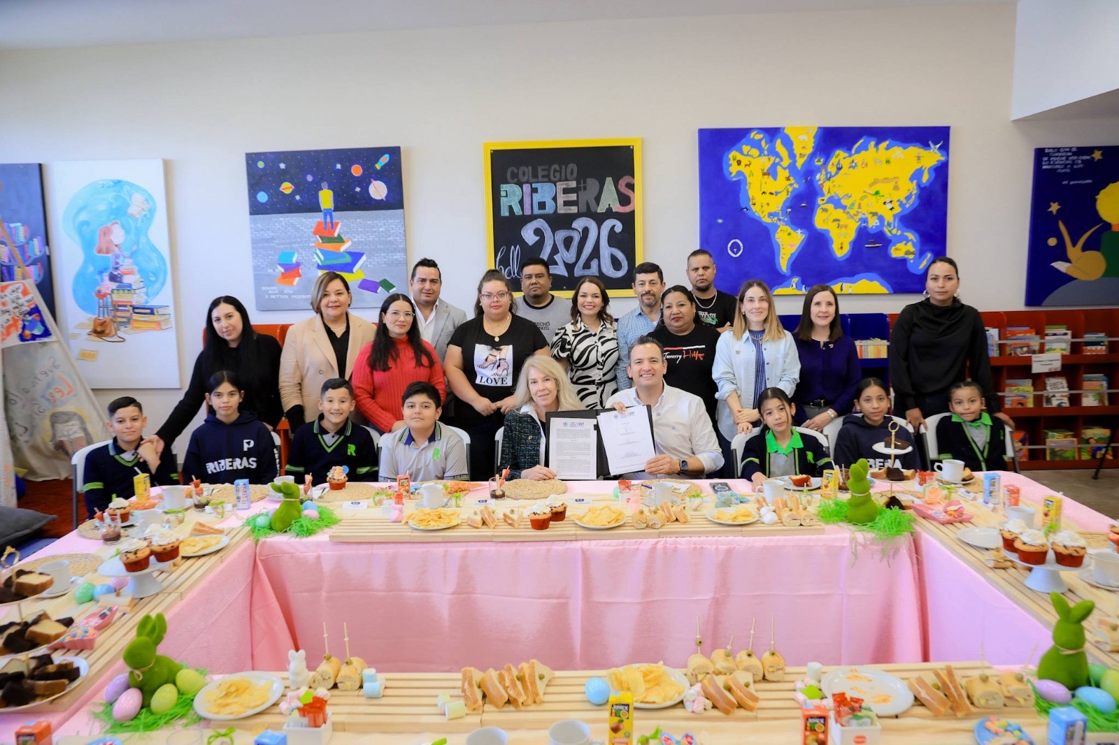 CHIHUAHUA CAPITAL.- Mediante una firma de convenio con Promesa Educativa para México A.C., el alcalde Marco Bonilla se comprometió con la educación de niñas, niños y adolescentes del Colegio Riberas, para impulsar sus estudios en este espacio que cuenta un alto nivel académico a un costo accesible en beneficio de las familias que viven al norte de la ciudad.