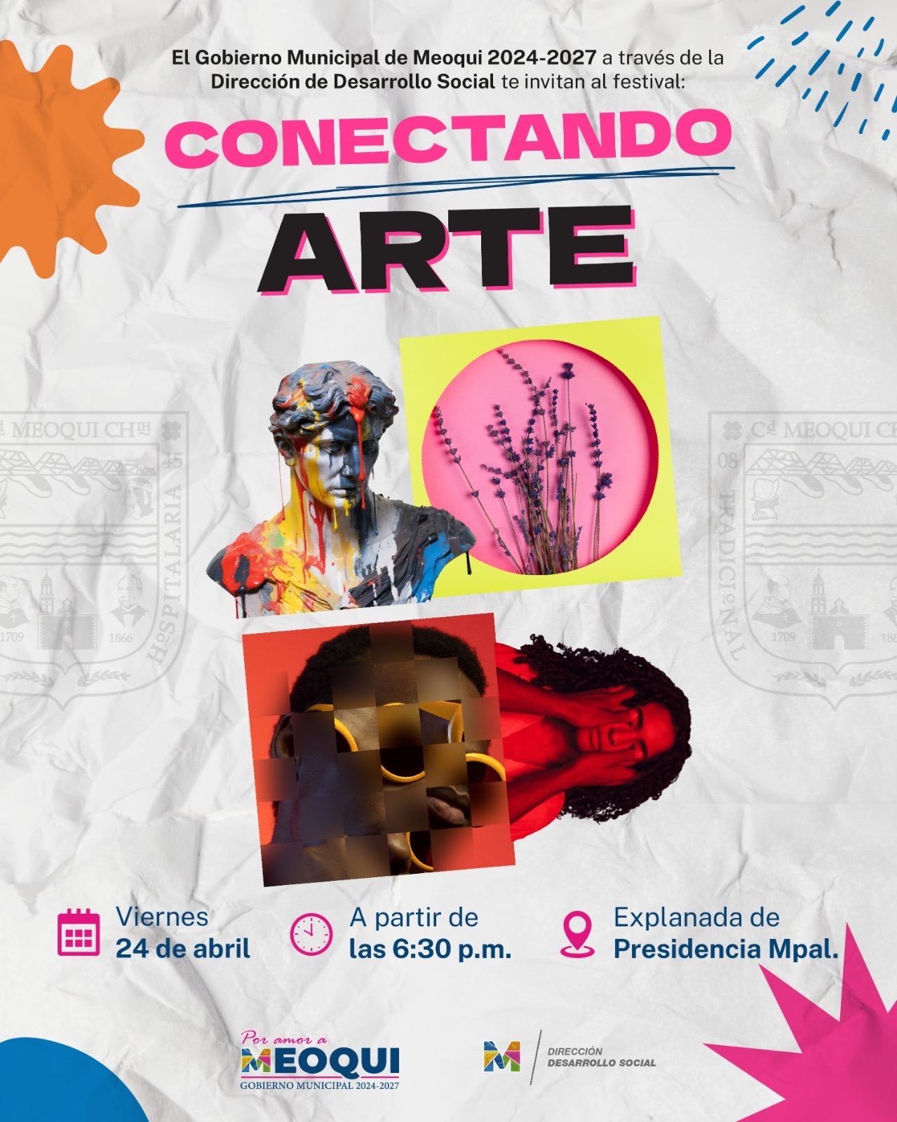 Meoqui.- En el marco del Día Internacional del Arte, el Gobierno Municipal de Meoqui, a través de la Dirección de Desarrollo Social, invita a la ciudadanía a asistir al evento “Conectando Arte”, este viernes 24 a partir de las 6:30 de la tarde en la explanada de la Presidencia Municipal, donde se presentará una amplia variedad de expresiones artísticas.