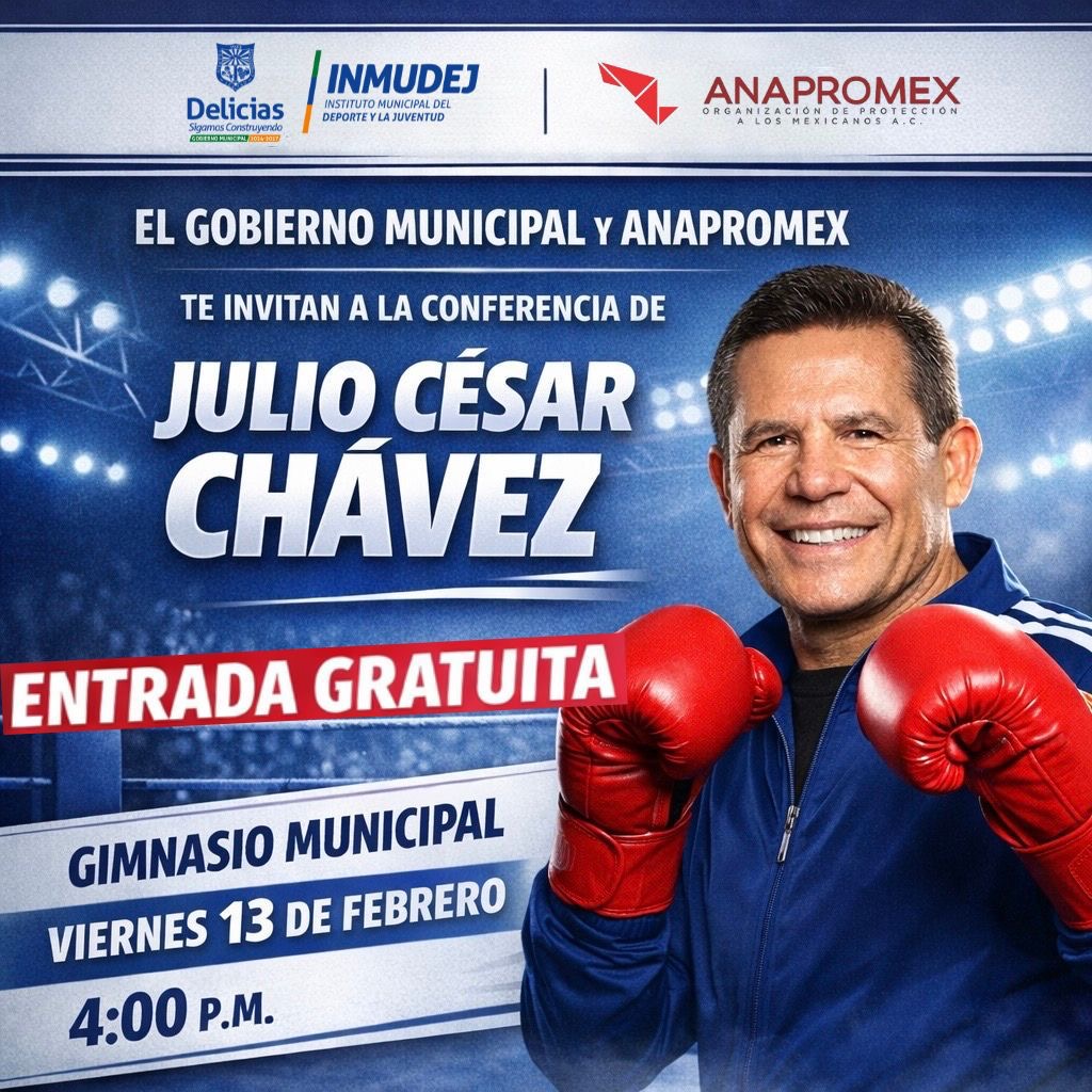 Delicias.- El Gobierno Municipal invita a la ciudadanía a asistir a la conferencia que ofrecerá el reconocido pugilista mexicano Julio César Chávez, quien compartirá su experiencia de vida, su trayectoria deportiva y un mensaje de motivación dirigido principalmente a jóvenes, deportistas y familias del municipio.