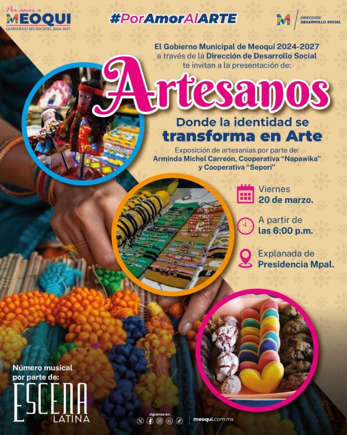 En el marco del programa “Por Amor al Arte”, el Gobierno Municipal de Meoqui, a través de la Dirección de Desarrollo Social, invita a la ciudadanía a la exposición “Artesanos, donde la identidad se transforma en Arte”, la cual se llevará a cabo este viernes 20 de marzo a partir de las 6:00 de la tarde en la explanada de la Presidencia Municipal. La directora de Desarrollo Social, Zenyith Pérez, informó que este evento se realiza en conmemoración del Día Internacional del Artesano, con el objetivo de reconocer y promover el talento de artesanas y artesanos, así como preservar las tradiciones culturales.