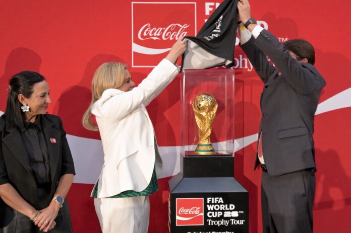 Chihuahua.- La gobernadora Maru Campos en conjunto con Arca Continental y Coca-Cola México dio la bienvenida a la capital del estado al Trofeo de la Copa Mundial de la FIFA 2026, presentado por Coca-Cola en ceremonia realizada en el Centro de Convenciones Expo Chihuahua.
