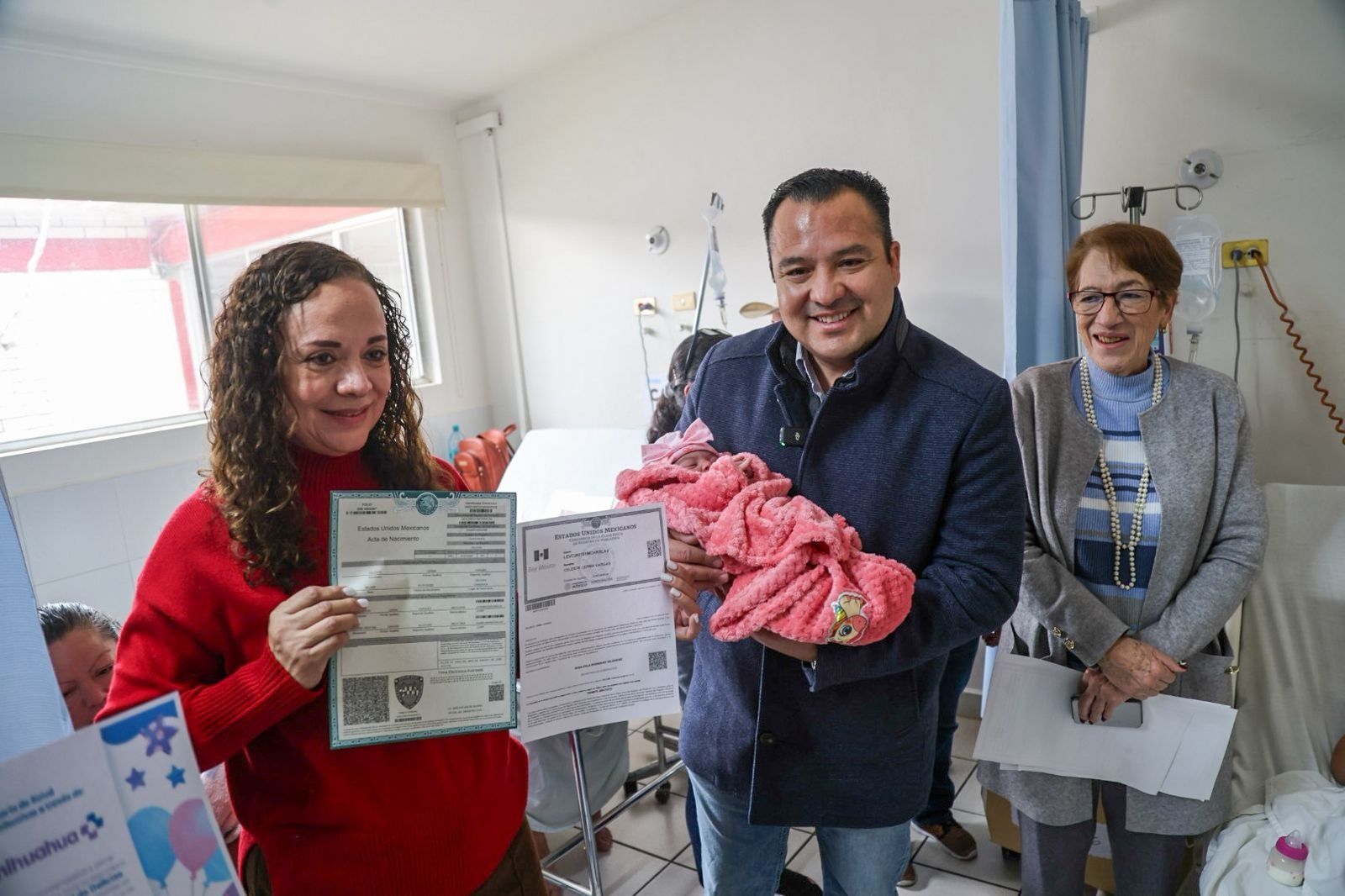 Durante su visita al hospital, el alcalde Jesús Valenciano García felicitó a los padres y conoció a la primera bebé del 2026 en Chihuahua. En el lugar, la oficial del Registro Civil, Adela Elizalde, realizó la entrega gratuita del primer acta de nacimiento del año, como parte de la tradición institucional.