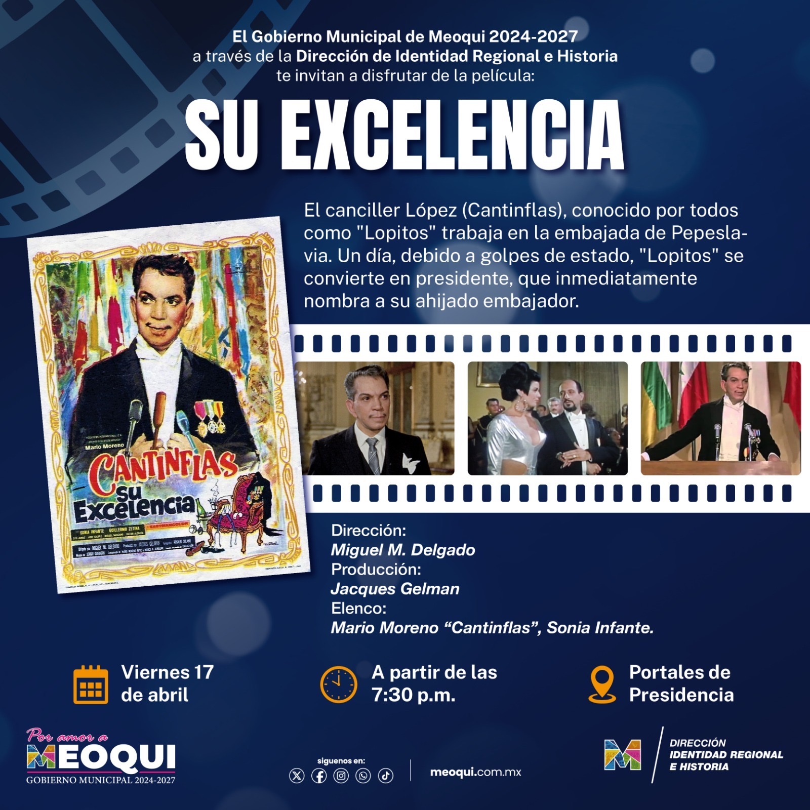 Meoqui.- Este viernes 17 de abril regresa a Meoqui el tradicional Cine Club Histórico con la proyección de la película “Su Excelencia”, protagonizada por Mario Moreno “Cantinflas”, la cual se llevará a cabo a partir de las 7:30 de la tarde en los portales de la Presidencia Municipal. Por ello, el Gobierno Municipal hace una cordial invitación a todas las familias para disfrutar de esta actividad.