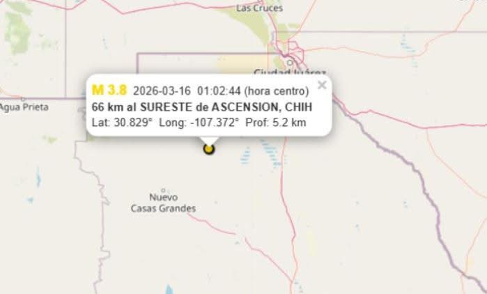 El movimiento telúrico ocurrió a la 1:02:44 a.m. del 16 de marzo, con un epicentro ubicado a 66 kilómetros al sureste de la cabecera municipal de Ascensión, en un área de campos agrícolas lejos de cualquier zona urbana. La magnitud del sismo fue de 3.8 grados, con una profundidad de 5.2 kilómetros.