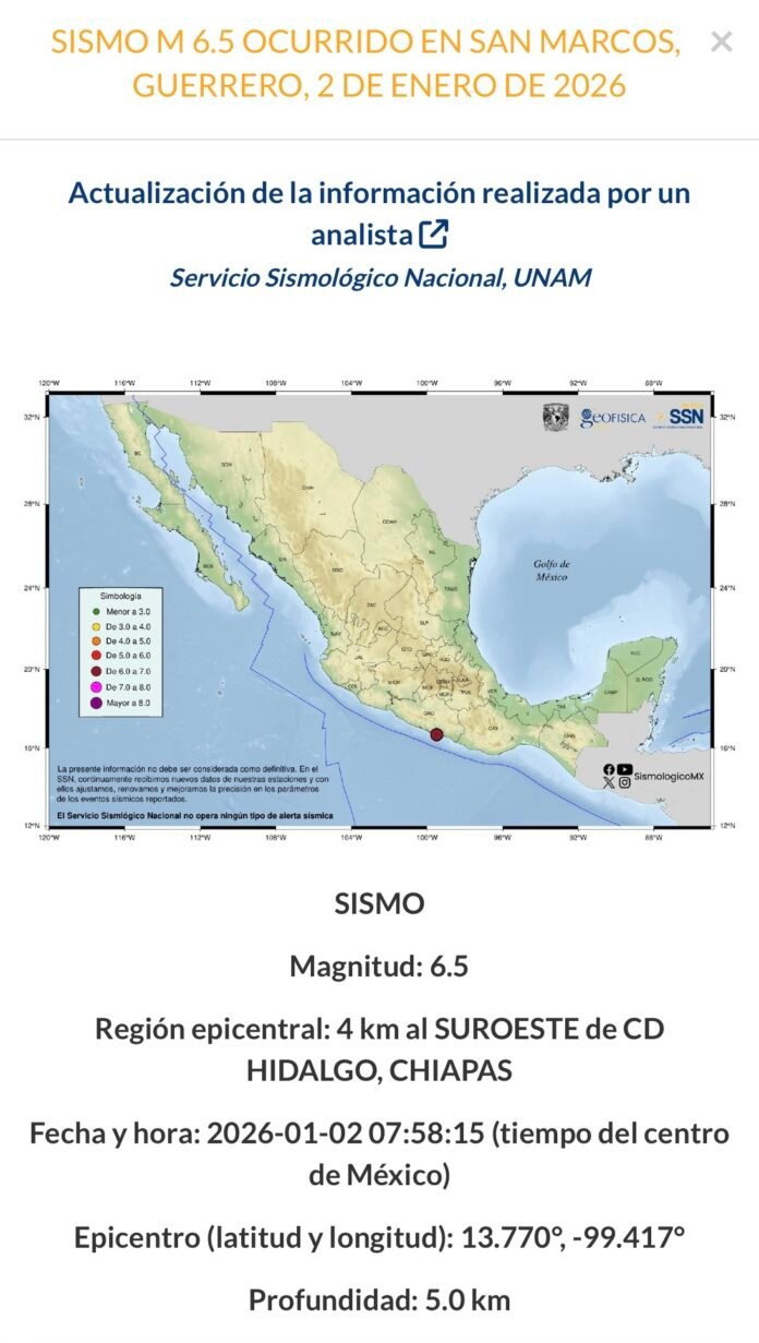 La mañana de este viernes 2 de enero, un temblor de 6.5 grados en la escala de Richter tuvo epicentro en Hidalgo, Chiapas.