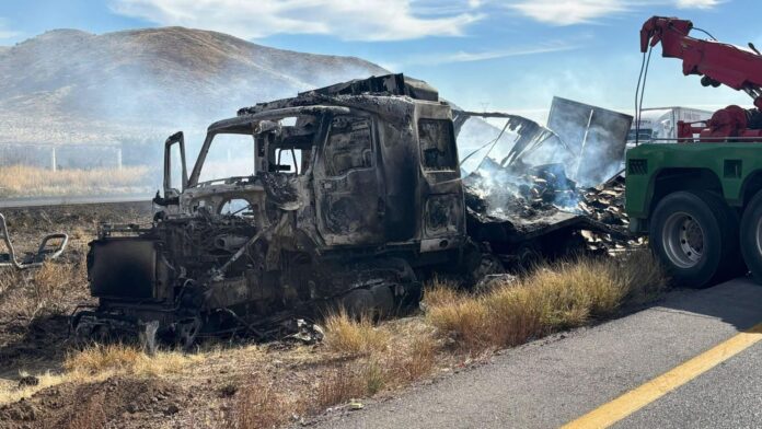 Delicias.- Un tractocamión cargado con cartón quedó totalmente calcinado tras chocar con otro en el km 189 de la carretera Delicias-Chihuahua, sin dejar heridos.