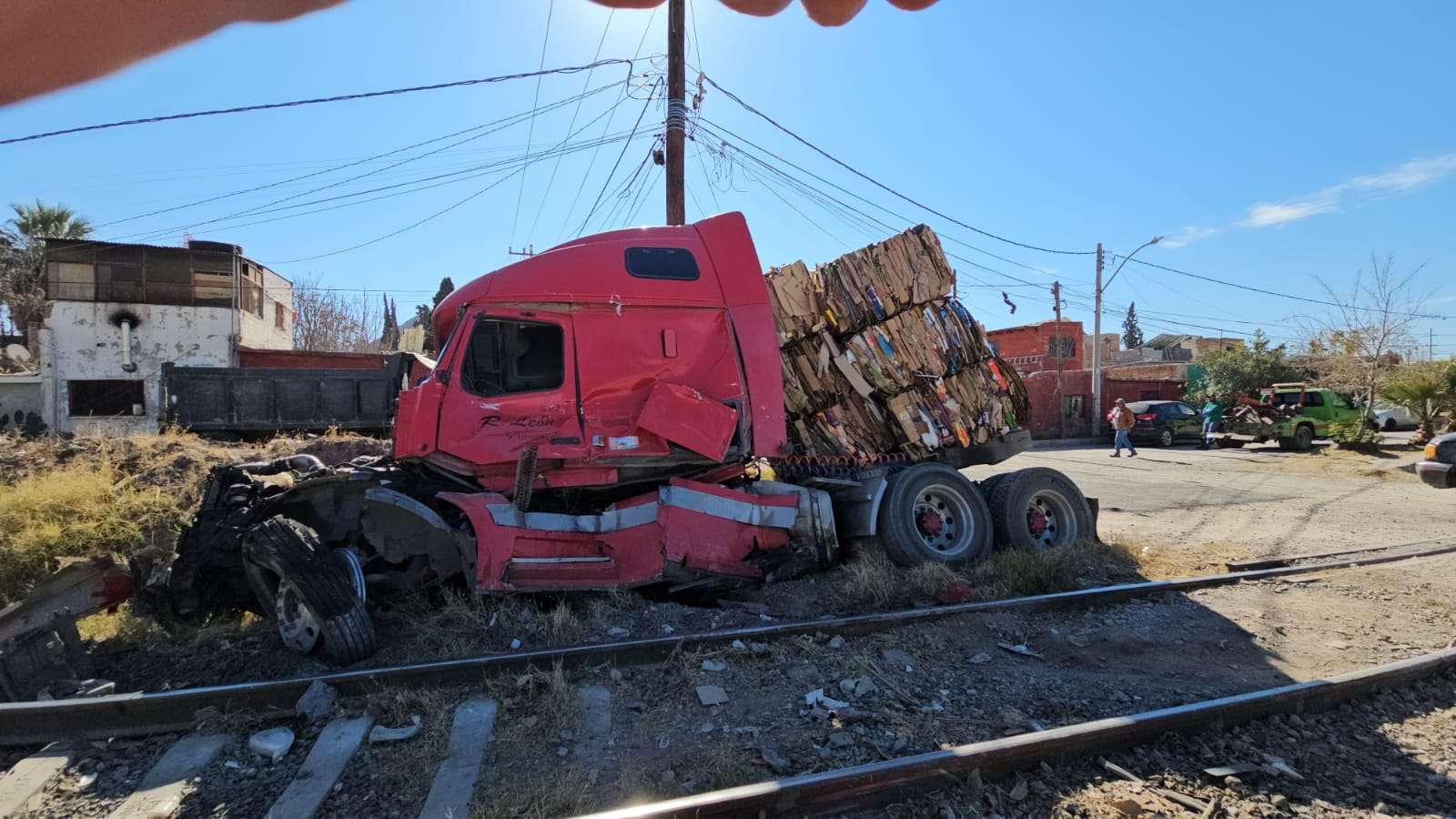 Chihuahua.- Un tráiler fue chocado por el tren en el cruce ferroviario de la calle 57, en el exterior de la Papelera de Chihuahua, al momento que el camión se quedó se descompuso y quedó atravesado en las vías.