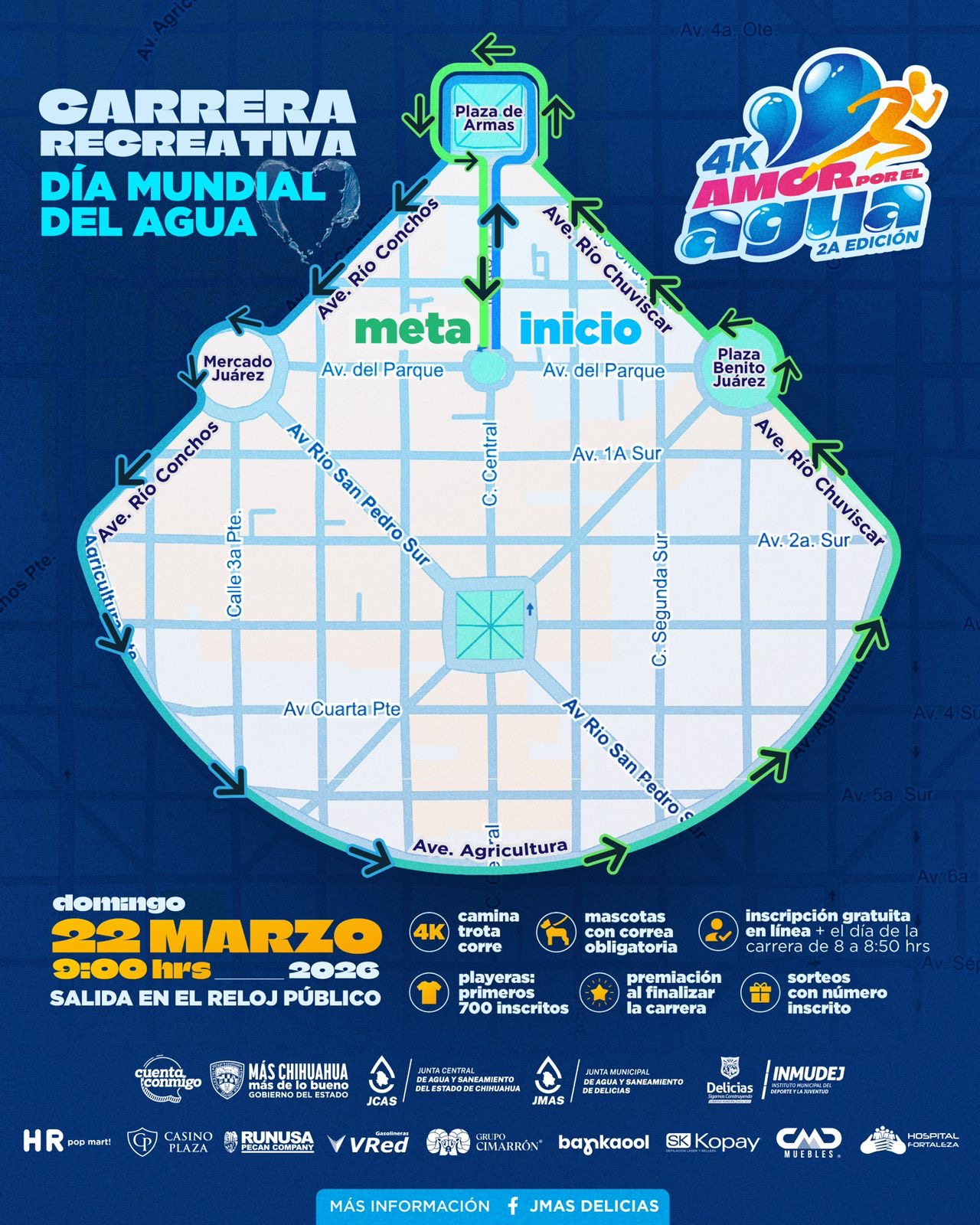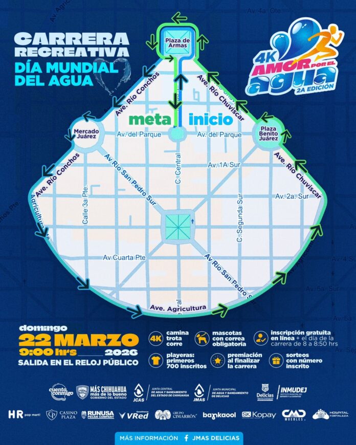 Delicias.- La Junta Municipal de Agua y Saneamiento (JMAS) de Delicias invita a toda la familia a participar en la carrera recreativa “Amor Por El Agua”, que se llevará a cabo el domingo 22 de marzo. La salida será a las 9:00 de la mañana desde el Reloj Público.